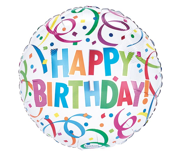 17″ packaged round, Helium Helper. White with colorful confetti and streamers with the message “Happy Birthday!”