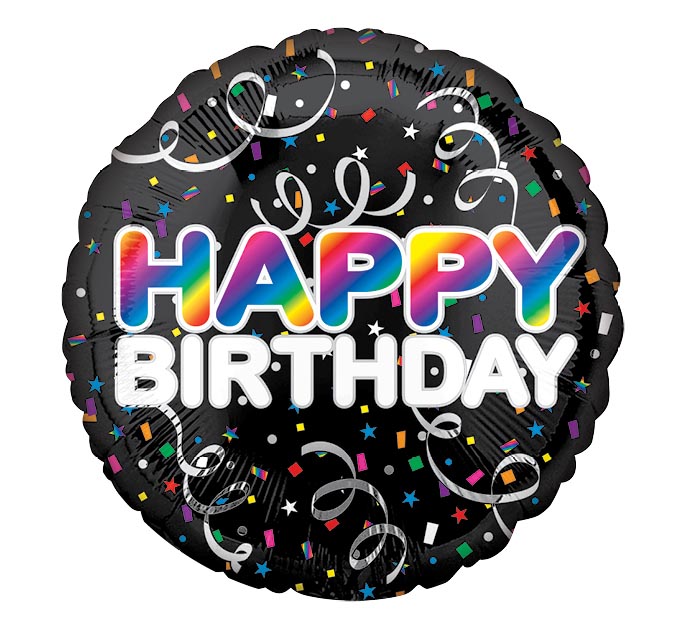 18″ Packaged “Happy Birthday” balloon has a black background with colorful streamers and confetti.