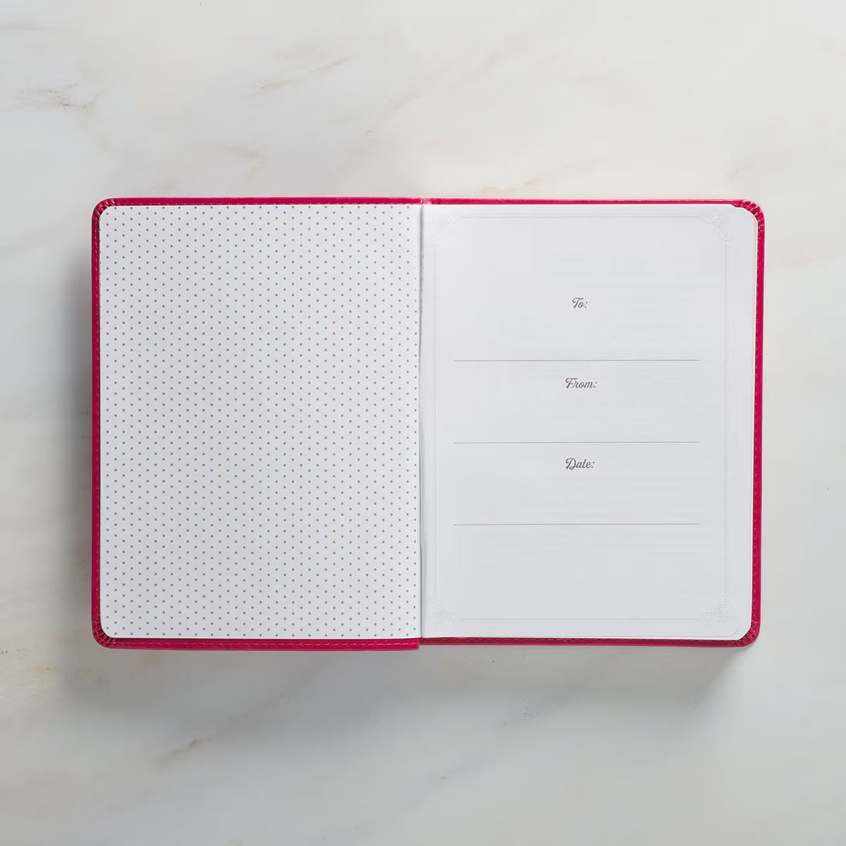 Topstitching along the rounded edges of the book ensures a quality construction. Gilt-edging adds a simmer to the design and elevates it to the perfect gift. A second luxury feature is the attached ribbon marker to mark your pages. At the front of the book, a presentation page invites you to record the gift-giving occasion.