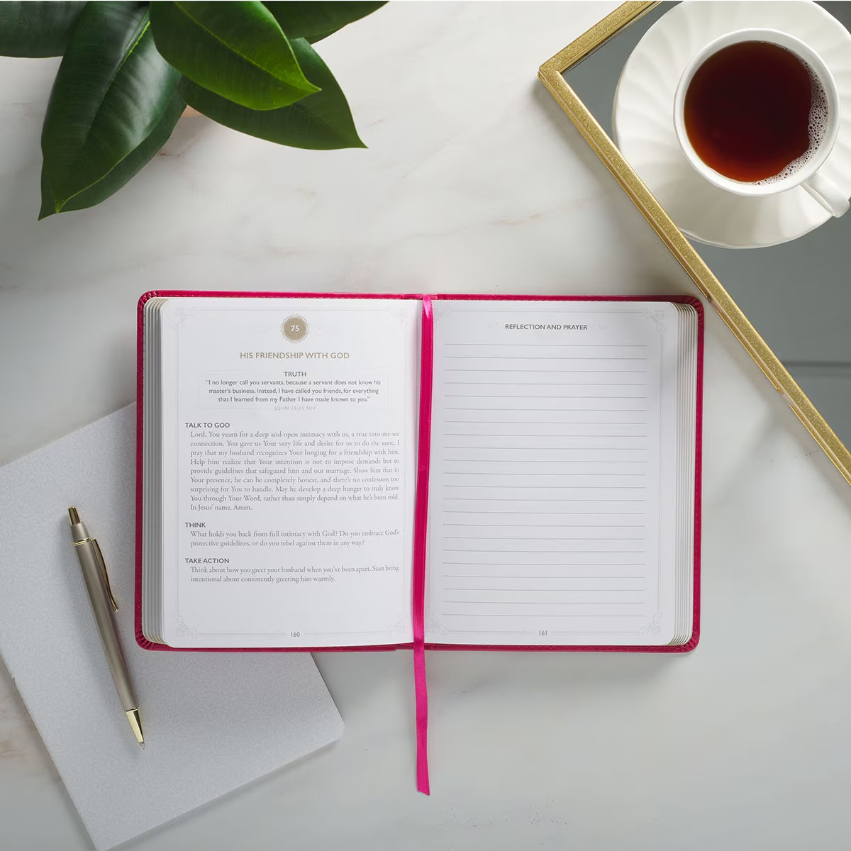 The two-color interior pages feature a delicate frame with corner scroll designs on each page. The left pages include a topic, a Scripture passage, a prayer, a prompt for reflection, and another prompt for a response. The right pages are lined for journaling. The prayers are arranged topically. As you pray and reflect, you will see the fruit of faithful prayer in your husband, yourself, and your marriage.