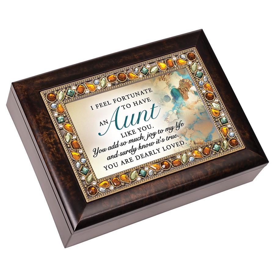 Aunt You Are Dearly Loved Amber Tone Jeweled Musical Keepsake Box with Photo Frame Lid by Cottage Garden – Rich and opulent, this keepsake box is set with amber, green, gray, blue and clear sparkling gem-like stones in a dainty antique gold beaded trim. Edges of lid and sides of box have a deep espresso finish with soft amber tone highlights showing a distressed woodgrain pattern. The hinged lid is also a photo frame; it comes with a lovely art print, under glass, that reads: “I feel fortunate to have an Aunt like you, you add so much joy to my life and surely know it’s true. You are dearly loved.” Print can be changed out for a favorite 6″ x 4″ photo; the removable back under lid makes it easy. Inside box is a small compartment with clear glass top that shows the high quality Sankyo musical movement. When key under box is wound, music will play when lid is open and stop when it is closed. Plays the song “Wind Beneath My Wings.” Storage compartment has a luxurious black velvety lining. Decorative legs on bottom are padded to protect furniture. Box is made of a super-sturdy polymer that resists cracking and chipping. Overall size is 8″ x 6″ x 2 5/8″.