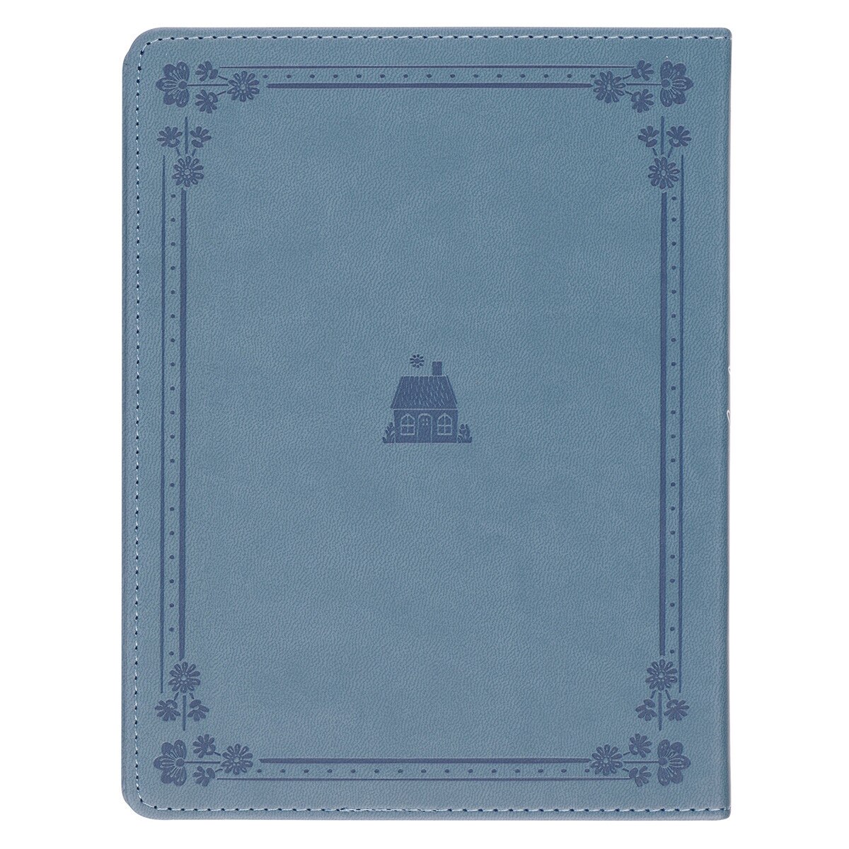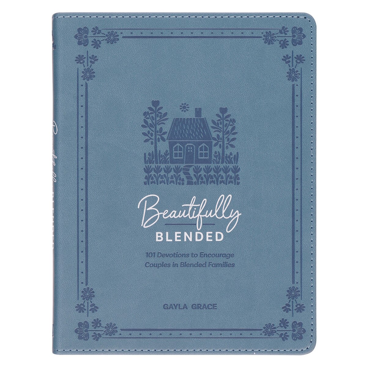 The slate blue faux leather cover of Beautifully Blended features an elegant heat-debossed floral and dotted border that frames a flourishing house—a symbol of the vibrant home life Christ can bring.