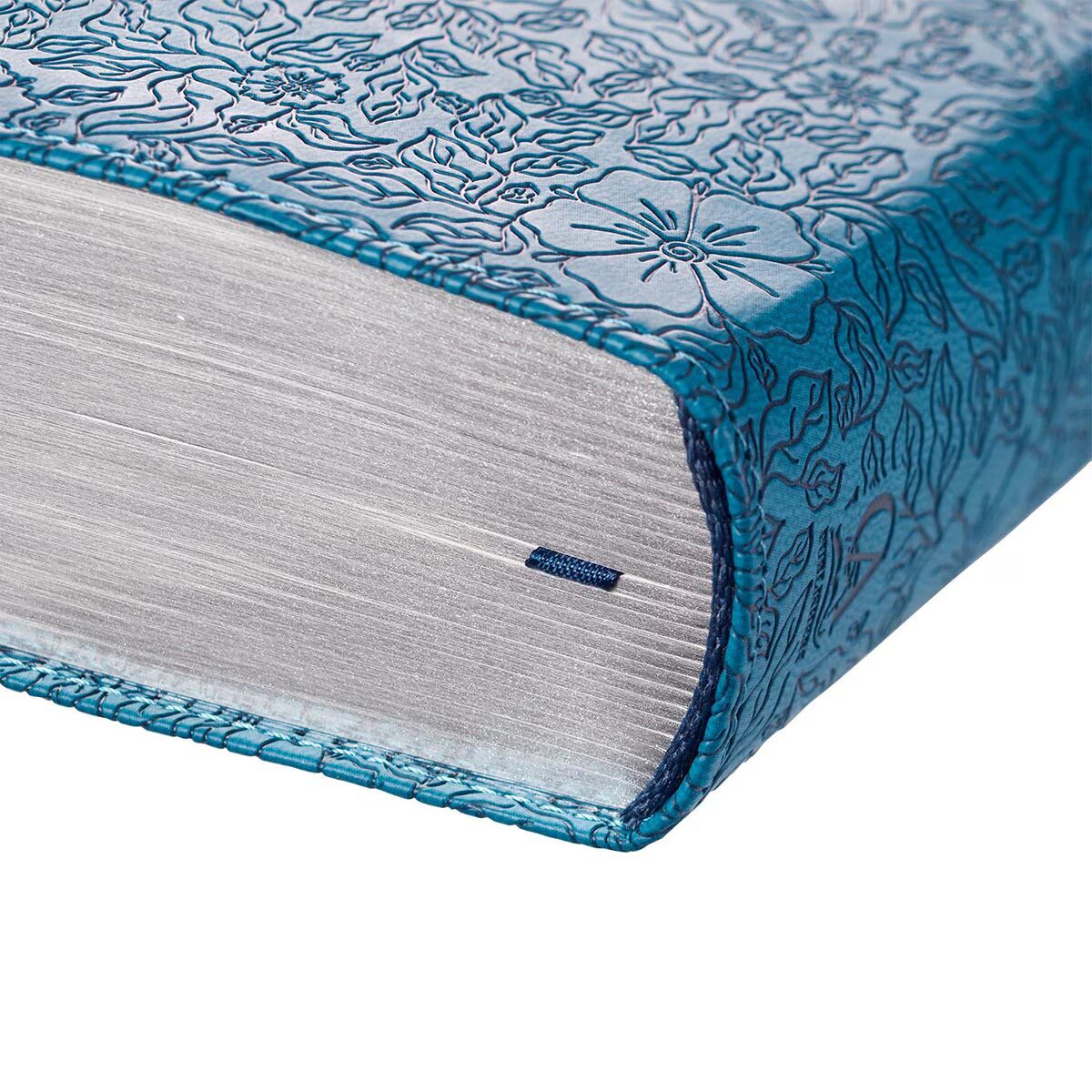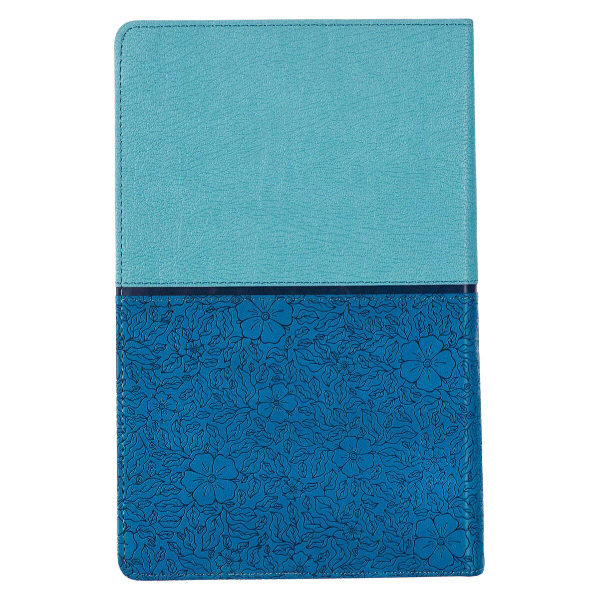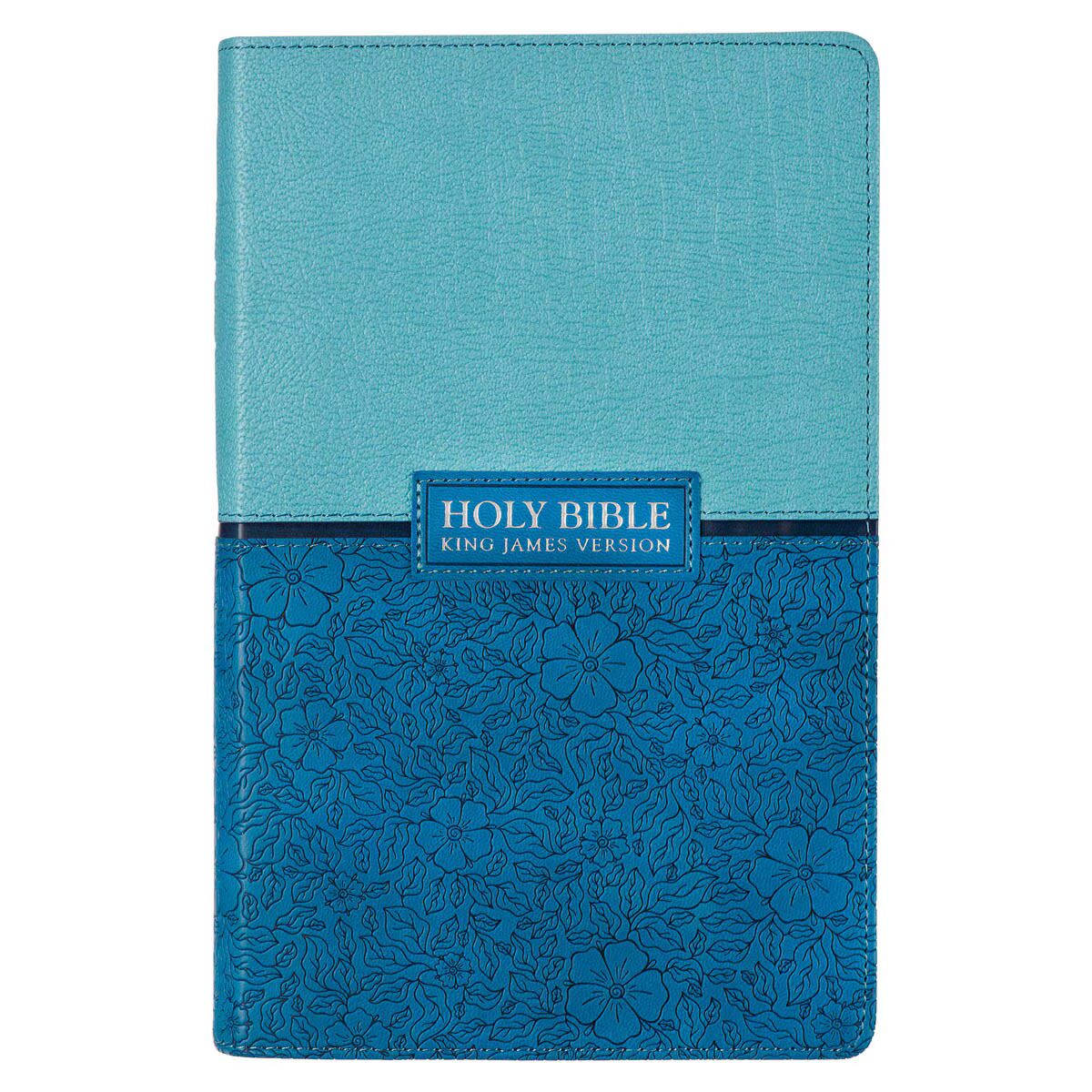 The top half of the King James Bible is wrapped in a texturized light blue faux leather while the bottom half is wrapped in a sapphire blue faux leather with a heat-debossed floral design. A navy blue band separates the two halves. The title of the Bible is heat-debossed and silver-foiled on a smooth sapphire blue patch appliquéd to the center of the design.