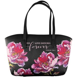 The front and back panels of the purse-style Bible case are screen-printed with large brown and blue flowers set against a navy blue background. The front panel features a slip pocket that is trimmed in honey-brown faux leather. The trim matches a small appliquéd patch that is heat-debossed with the sentiment. I can do all things through Christ who strengthens me. The Scripture reference is placed on the back panel in a small toffee-brown frame. Philippians 4:13