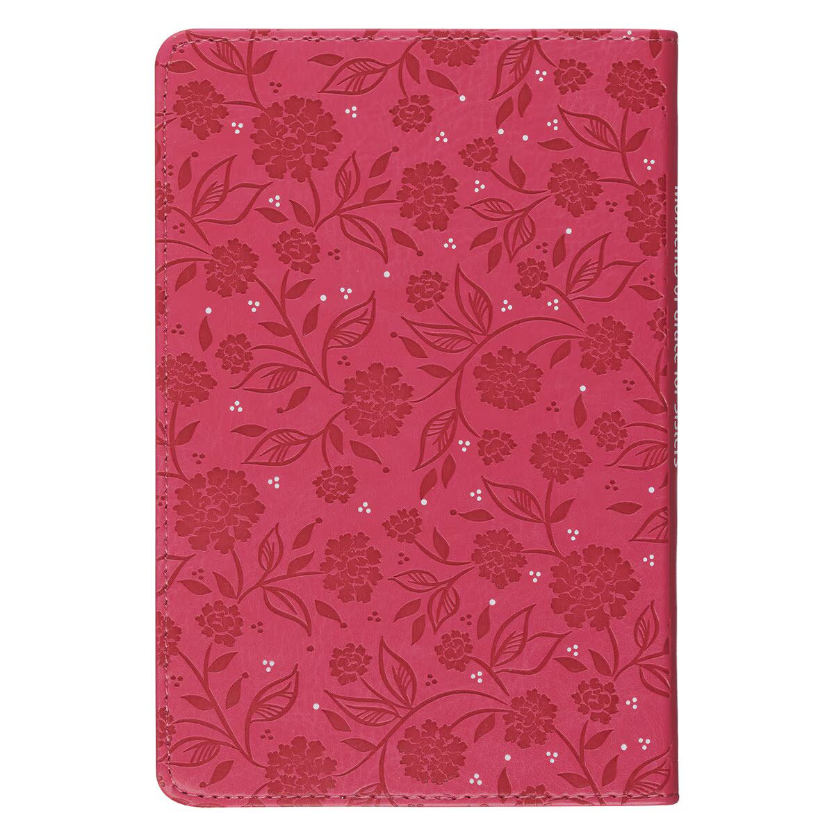 The fuchsia-pink faux leather cover is filled with heat-debossed flowers that are accented with white. The title is also heat-debossed and filled in with white. A white ribbon marker matches and makes it easy to keep your place as you read the book.
