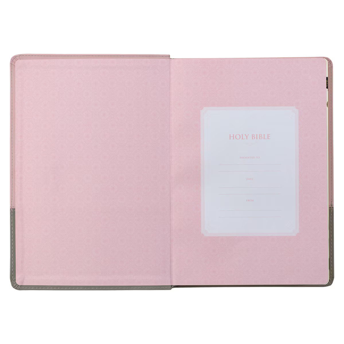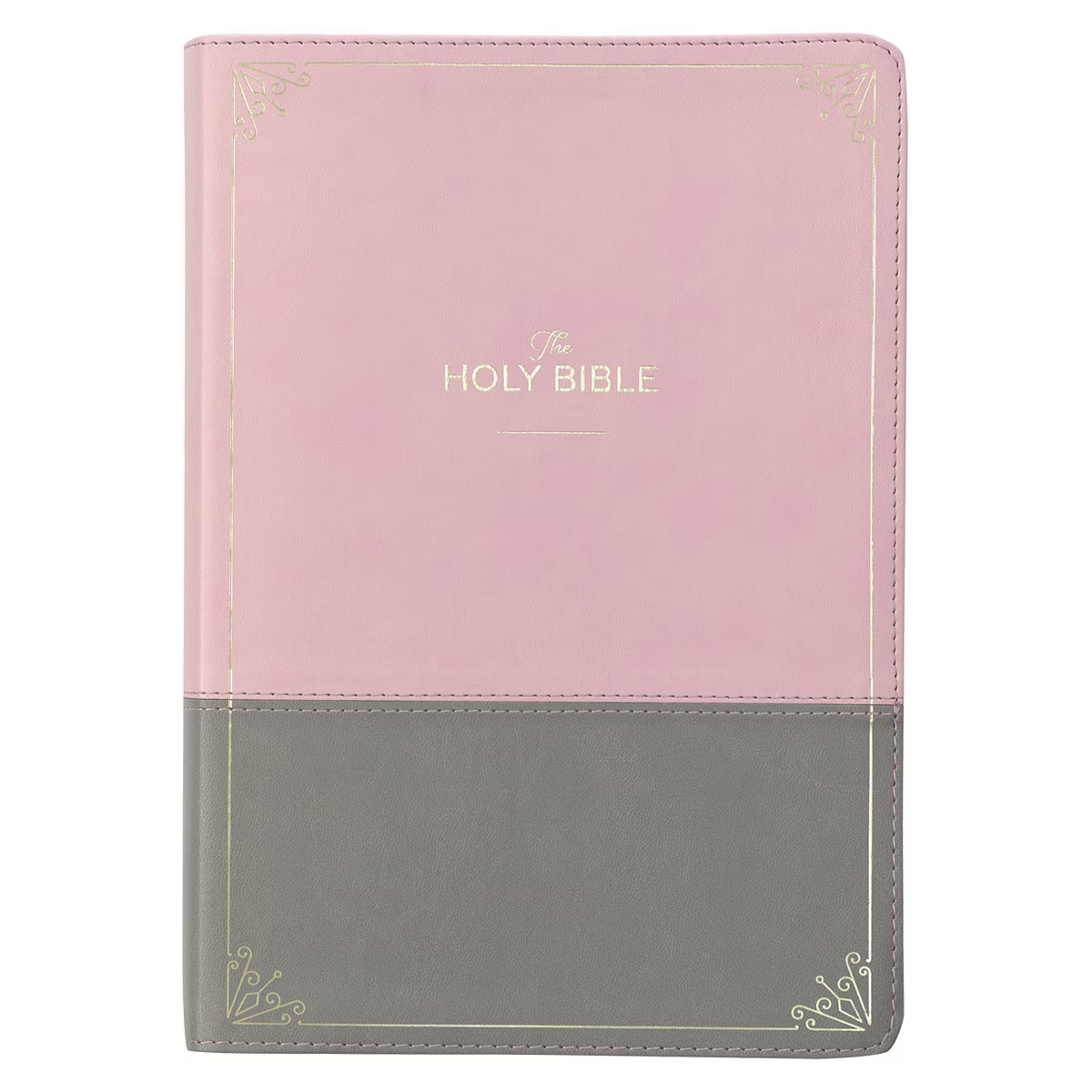 The smooth front and back covers of the Bible are separated in a color block design. A light rose pink band covers the top two-thirds of the cover, and a light dovetail gray band covers the bottom third. A double row of topstitching joins the color blocks together. A delicate gold-foiled frame with corner scroll designs runs along the borders of the book. The gold-foiled title appears on the front cover as well as the spine, where it is paired with the KJV version reference.
