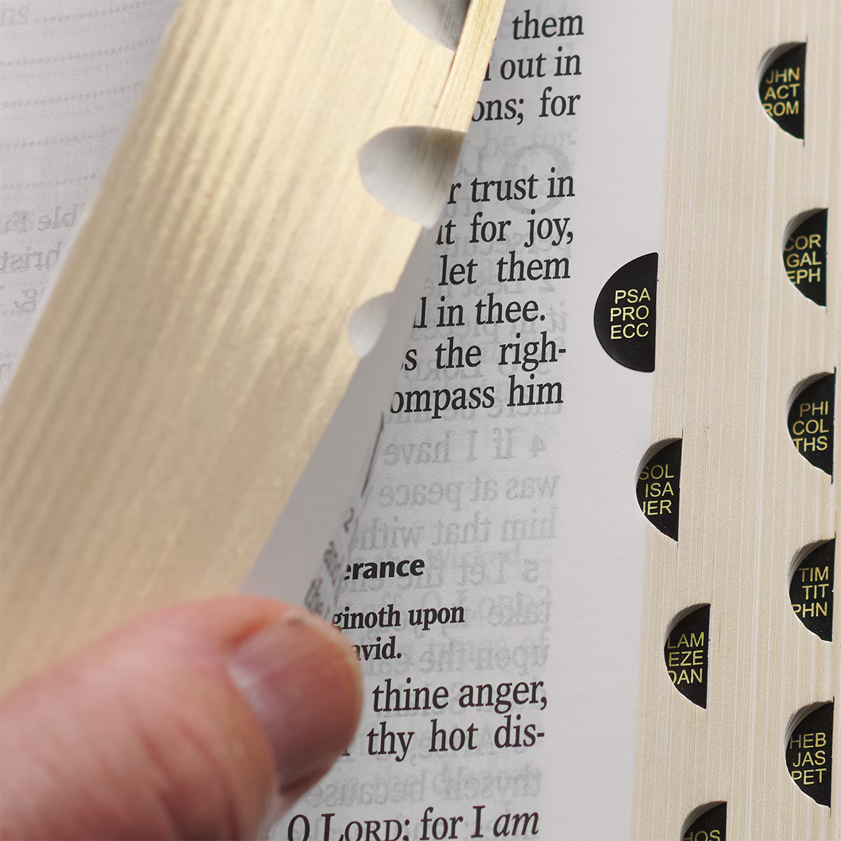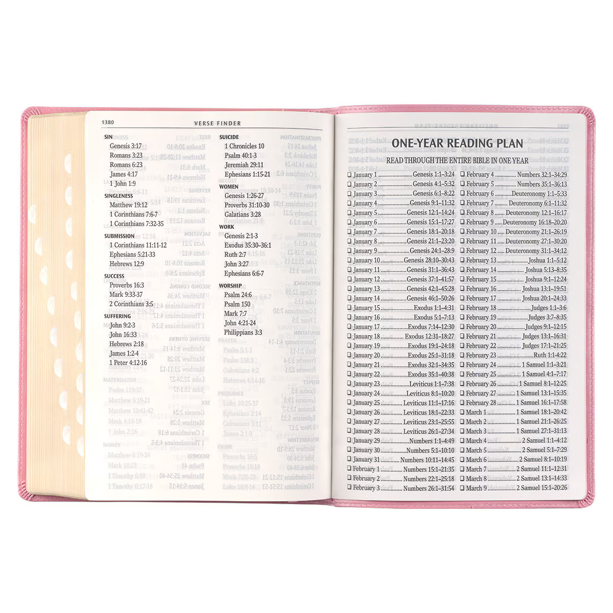 The Smyth-sewn flexcover opens completely flat without damaging the spine. A soft pink satin ribbon marker and thumb-indexing tabs offer an easy way to navigate and mark your Bible.