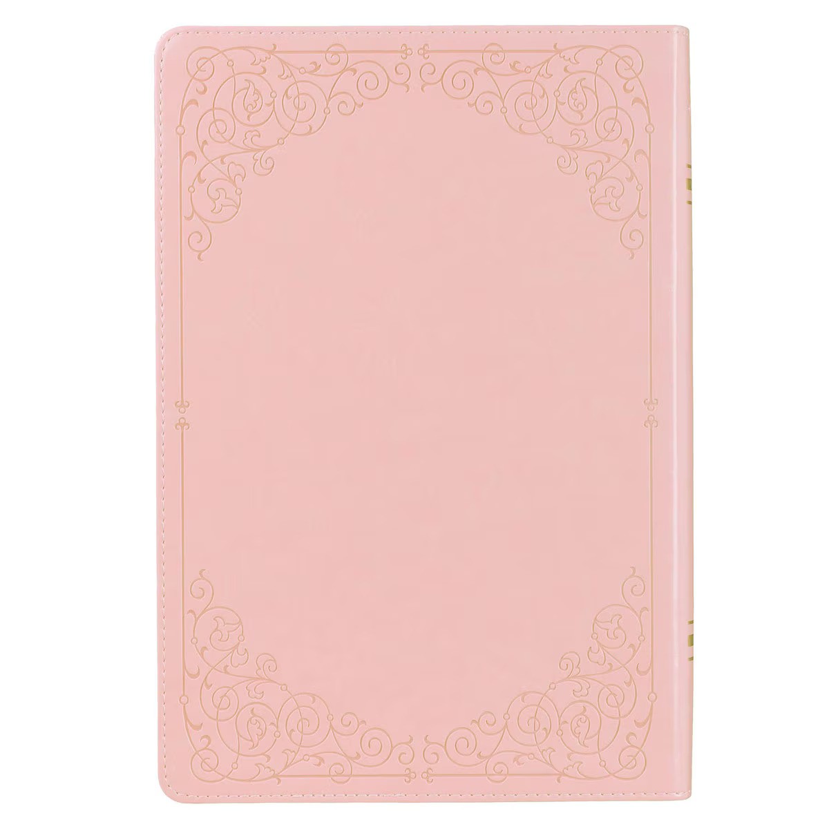 The Bible’s soft blossom pink cover is accented with a heat-debossed frame that is embellished with intricate scrollwork. The gold-foiled title and heat-debossed version reference are displayed within this frame.