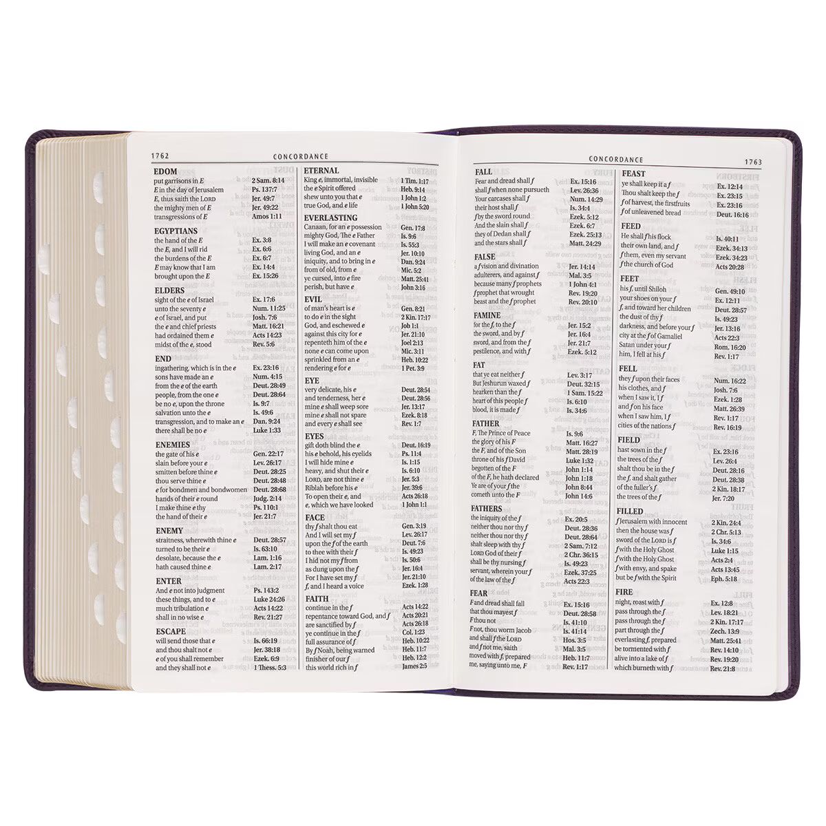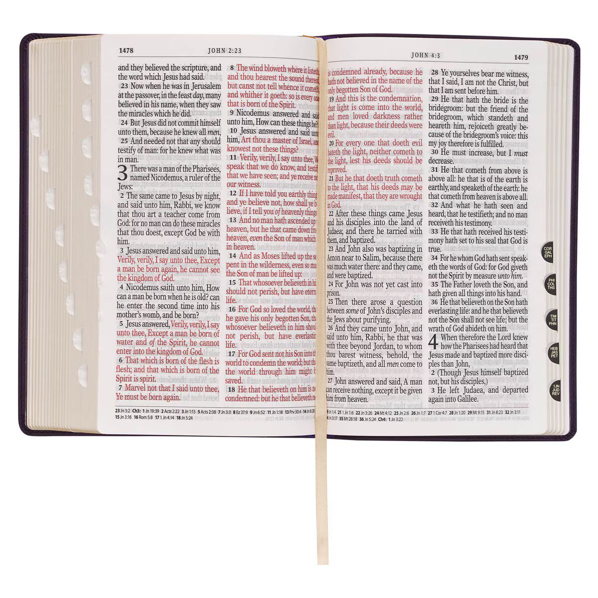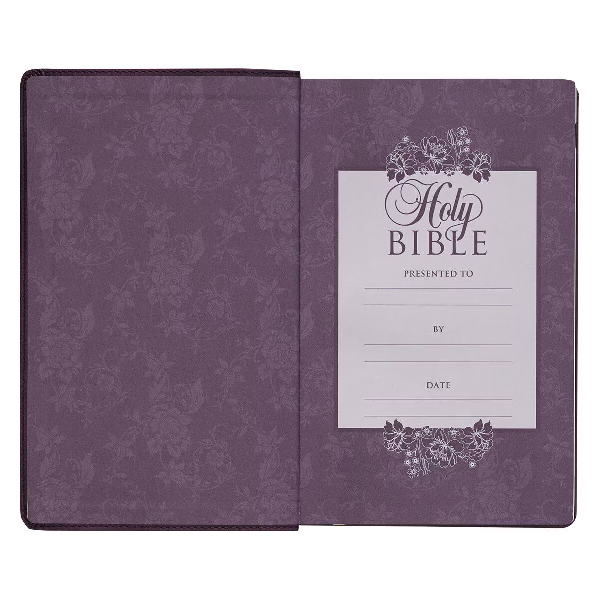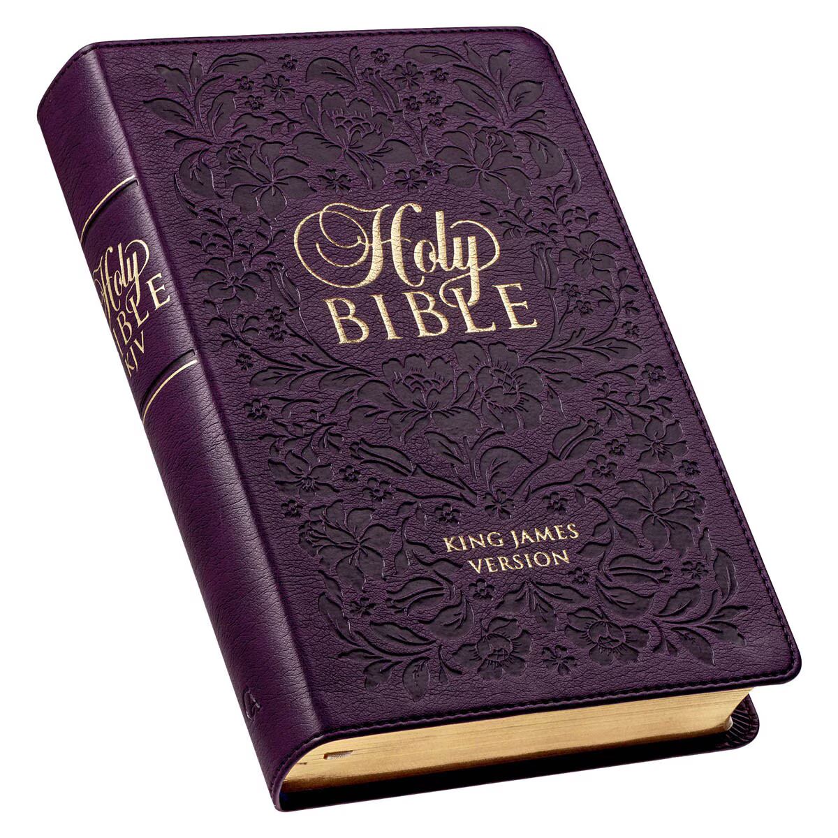 This Purple Floral Faux Leather Giant Print Standard-size King James Version Bible with Thumb Index features the Classic King James Version of the Bible wrapped in a rich purple cover.