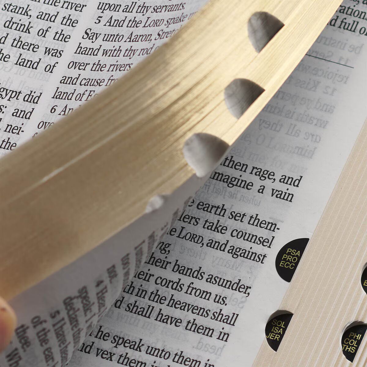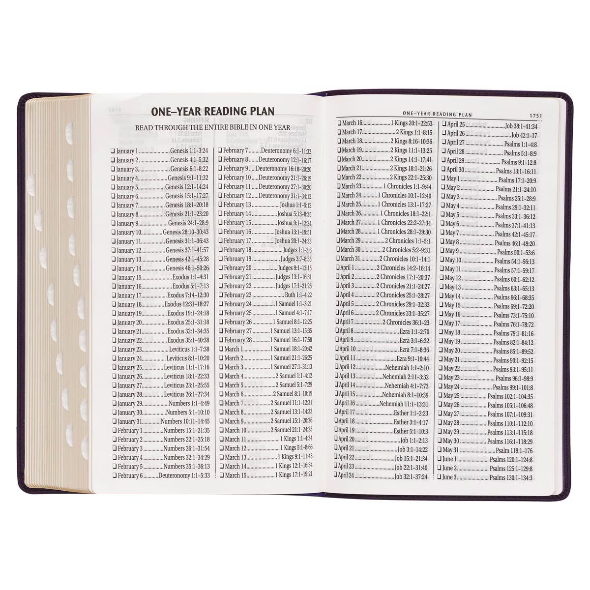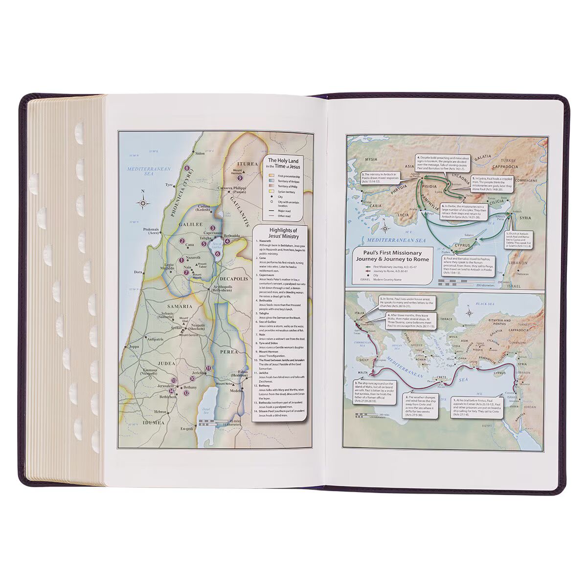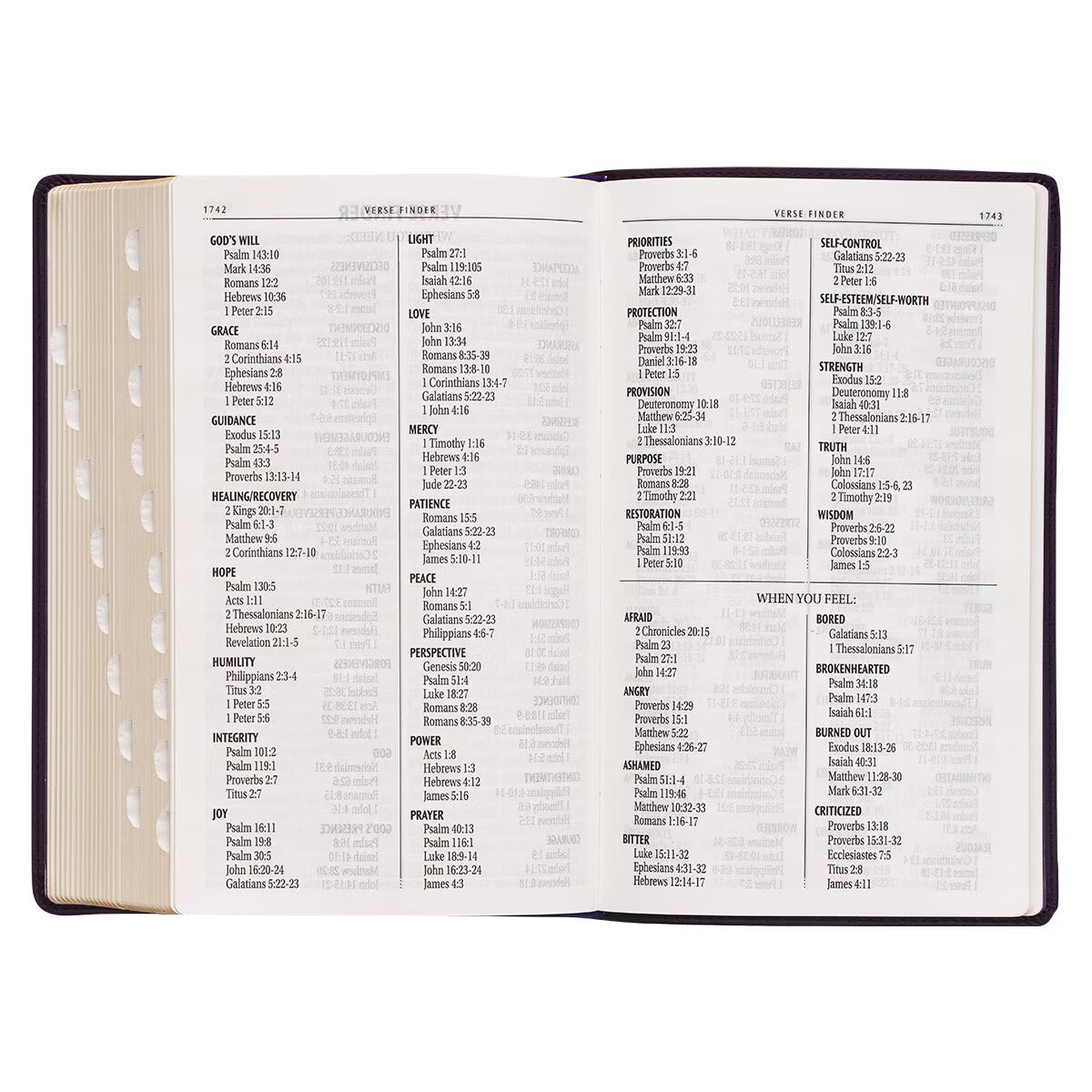 The back cover features a heat-debossed flowering branch while the spine features the same title and version reference as the front cover—also in gold foil. The gilt-edged pages perfectly complement the gold-foiled title. Purple topstitching around the edges of the cover adds subtle support to an already sturdy Bible. An attached purple satin ribbon will keep your place while the thumb indexing will help you navigate the Bible.