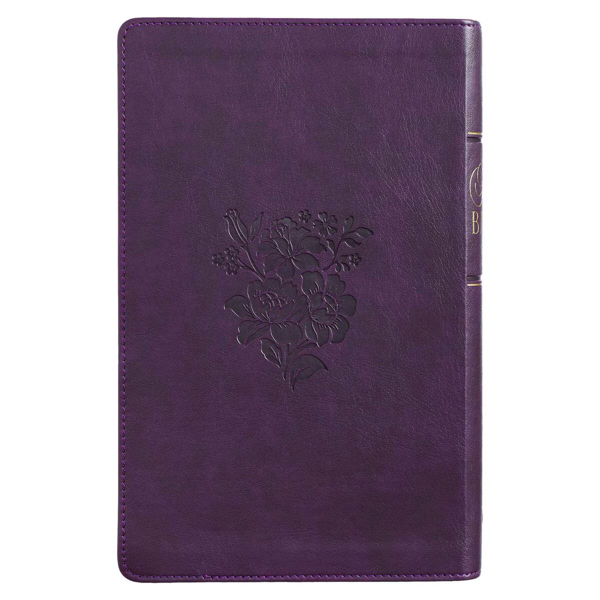 The regal purple faux leather front cover of the giant print Bible is heat-debossed with a subtle floral motif. The title and version reference are gold-foiled and placed inside two small vignettes.