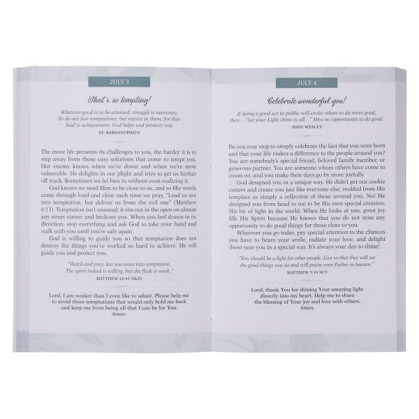 Inside, you’ll find 366 devotions, organized by month and following a calendar year. Each month is introduced by a verse from Proverbs 31, and every day features a title, quote, devotional passage, Scripture verse, and prayer. The content is printed in one color, making it easy to read and follow along, and a presentation page in the front allows you to personalize the devotional when it is given as a gift.