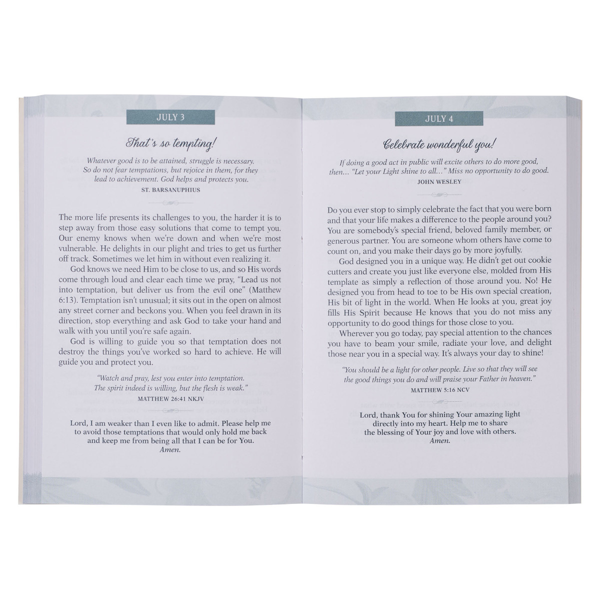 Blooming pink peonies are accented with UV-varnish and set against a pale green background on the cover of this softcover devotional book. A pale blue frame is adorned with the title that appears in green and UV-varnished pink lettering.